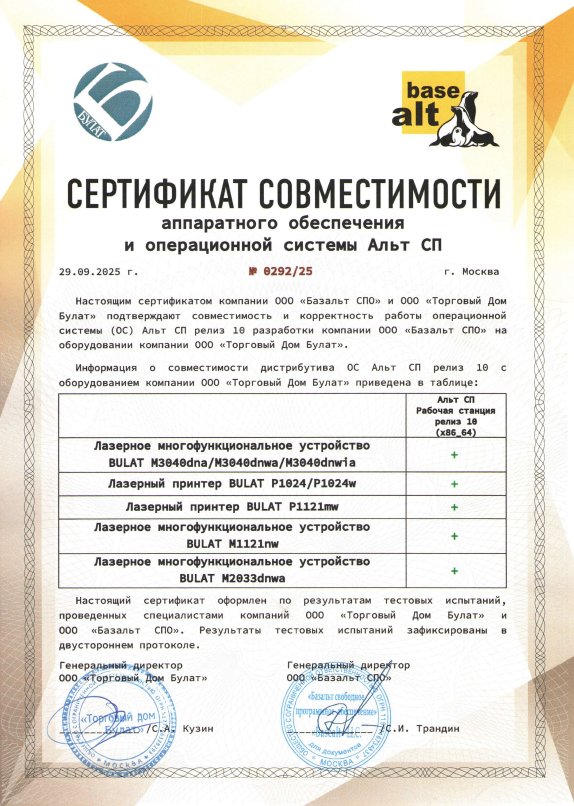 Компания «Булат» объявляет о получении сертификатов совместимости всех ее печатающих устройств с операционными системами «АЛЬТ СП РАБОЧАЯ СТАНЦИЯ РЕЛИЗ 10» и «АЛЬТ РАБОЧАЯ СТАНЦИЯ РЕЛИЗ 10».